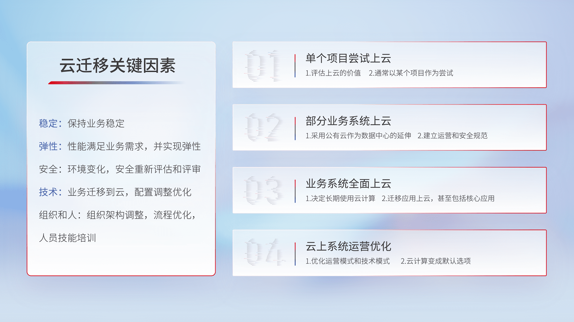 结合实际业务,,,从规划设计、、、云平台选型、、、云原生改造、、、、数据迁移、、集成交付,,迁移全过程为客户识别最佳上云路径,,做好风险识别管理,,,,设计网络架构、、身份权限、、、、安全审计合规、、、、操作审计、、、、日志审计、、、、监控告警策略、、、、多站点容灾设计等,,,对云上基础设施进行整体规划,,,提升IT治理水平,,以满足弹性、、高可用、、、、高性能的需求。。。
