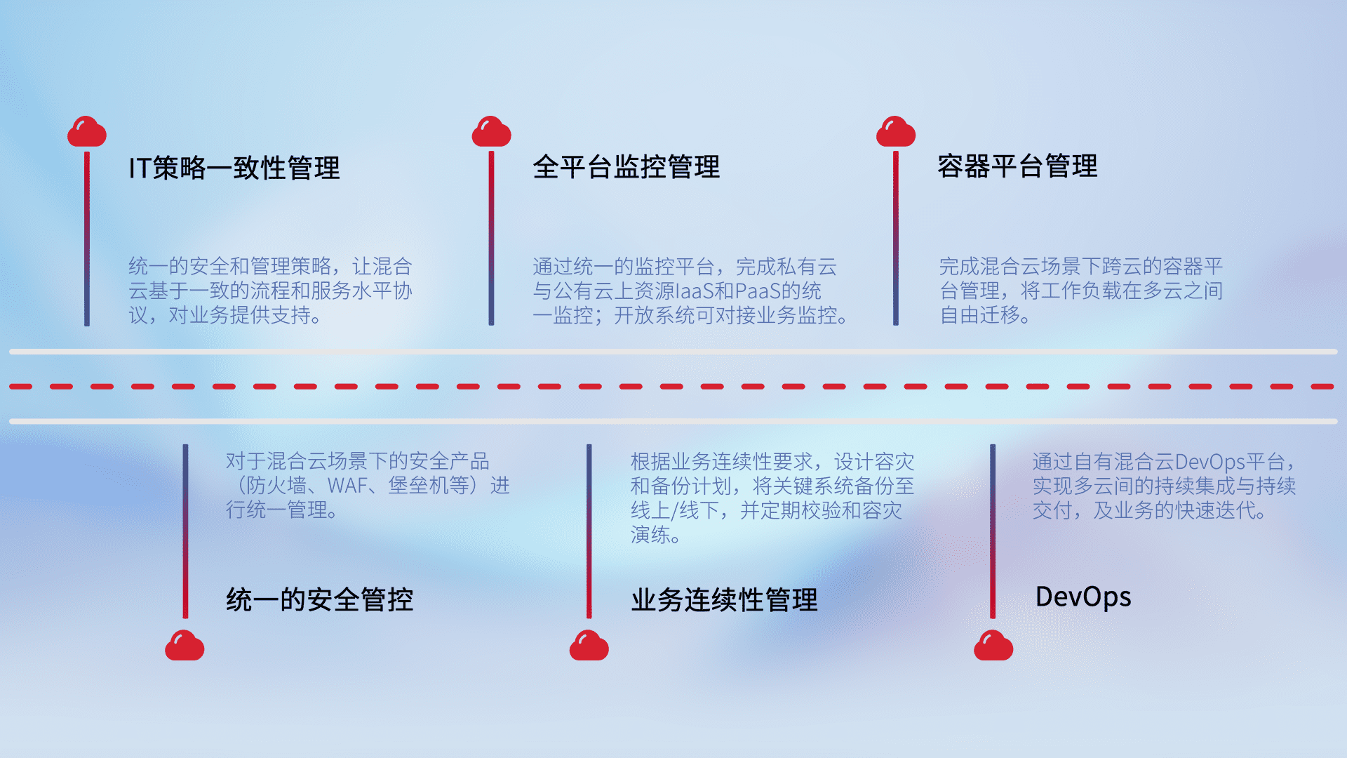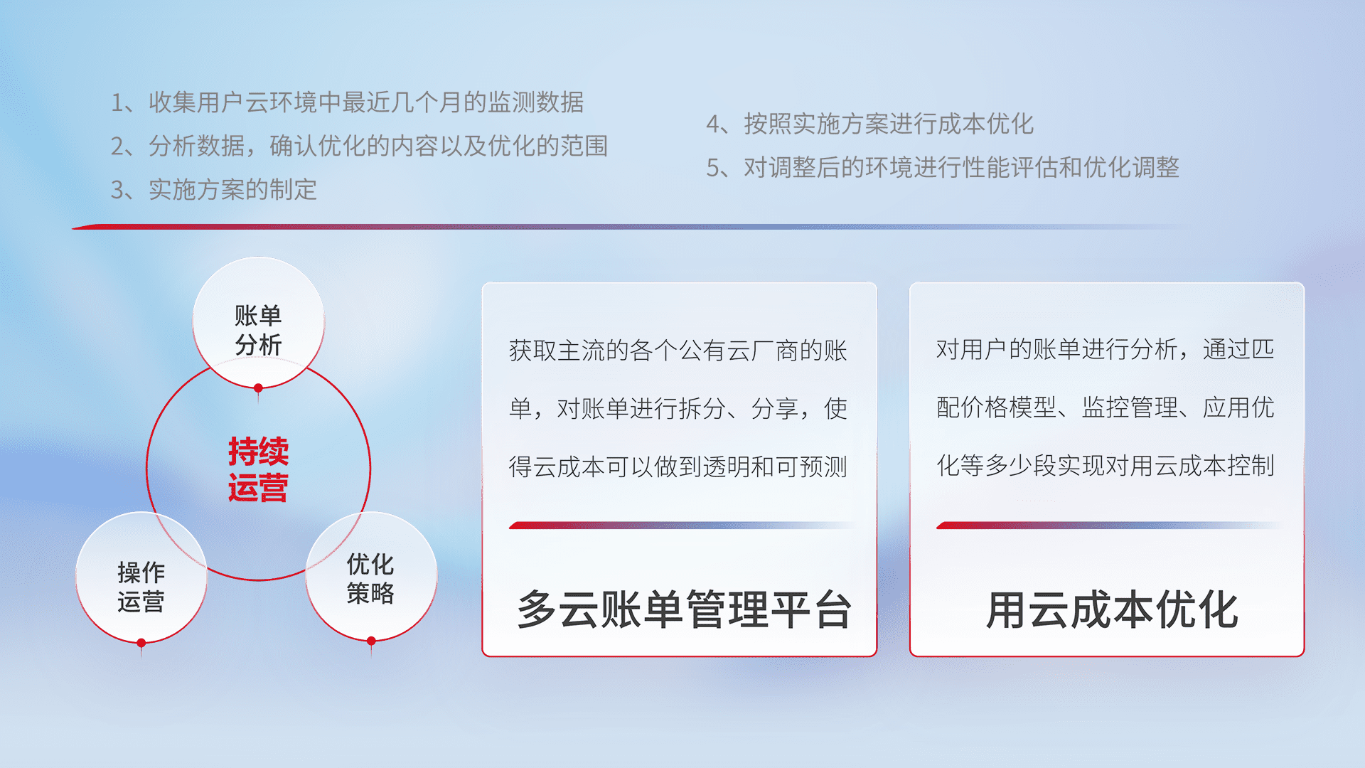 通过多云纳管,,,以统一的资源数据模型把客户的云资源进行抽象和封装,,,进而实现对多云资源的统一操作,,,保障云资源管理的可靠性、、、稳定性与可用性。。量身定制化运维内容,,,配置、、、、开发运维、、、补丁管理、、、、备份、、监控、、认证和访问管理、、、、审计和日常巡检等,,,保障在用云过程中的可靠度,,稳定度以及高可用率。。。。